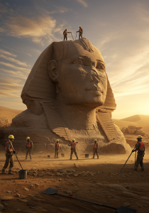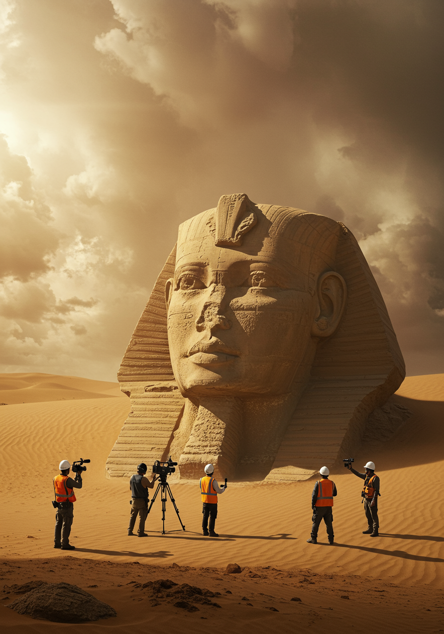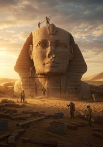 Restoration efforts are already underway. Scaffolding surrounds the statue, and teams of conservationists are using specialized tools to carefully remove sand, debris, and mineral deposits without damaging the fragile stone. Preliminary studies suggest that this newly discovered Sphinx could predate the Great Sphinx, which is traditionally attributed to Pharaoh Khafre and dated to around 2500 BCE.
