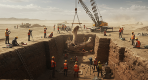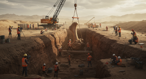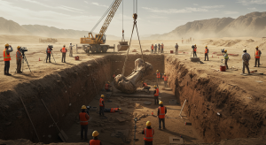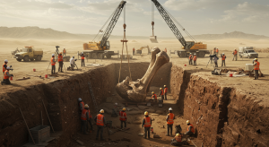 At a windswept excavation site, silence fell as workers and scientists watched cranes hoist an enormous bone fragment from the depths of the earth. The object, believed to be a colossal femur, towered over the men standing beside it, its scale unlike anything ever documented in modern paleontology. Experts rushed to measure and analyze the find, while camera crews captured the moment that may redefine our understanding of history.