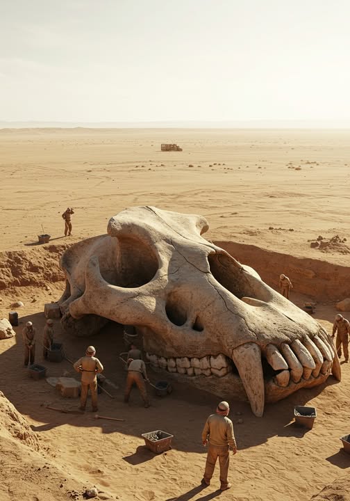 Amid the windswept dunes of an uncharted desert, a discovery has set the scientific world ablaze: a colossal skull, unearthed from beneath layers of sand, its size so immense it dwarfs the excavation team working tirelessly around it. Photographs from the site show researchers in helmets dwarfed by the massive cranium, carefully cataloguing fragments while heavy machinery assists in lifting bones that defy conventional classification