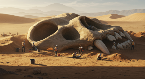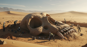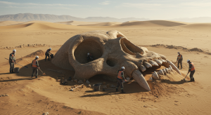 Amid the windswept dunes of an uncharted desert, a discovery has set the scientific world ablaze: a colossal skull, unearthed from beneath layers of sand, its size so immense it dwarfs the excavation team working tirelessly around it. Photographs from the site show researchers in helmets dwarfed by the massive cranium, carefully cataloguing fragments while heavy machinery assists in lifting bones that defy conventional classification