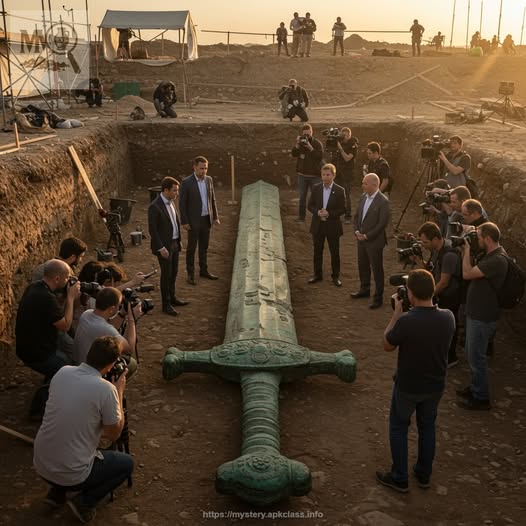 At a press conference this week, archaeologists presented an artifact that has already begun reshaping conversations about human history: a colossal bronze sword unearthed from deep beneath layers of soil and stone. Unlike any known weapon, this blade is several times the length and weight of a typical sword, its sheer scale making it impossible for an ordinary human to wield. Polished fragments reveal detailed craftsmanship—intricate engravings and geometric patterns—that suggest not only ceremonial significance but also a mastery of metallurgy far beyond what was thought possible for its estimated age.