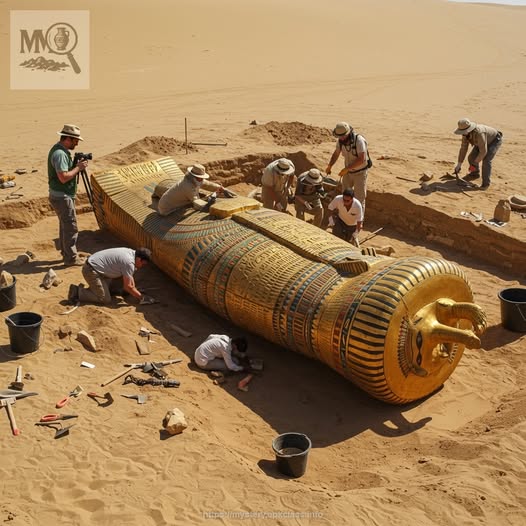 In a discovery that has stunned the global archaeological community, researchers working deep within the desert have uncovered a colossal golden sarcophagus, a relic unlike anything previously unearthed. The sheer scale of the coffin, gleaming beneath the relentless sun, dwarfs the excavation team as they labor carefully around it. Early images show an object so vast and ornate that experts are already calling it one of the most significant—and most mysterious—finds of the century.