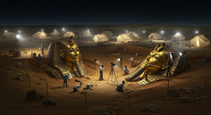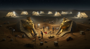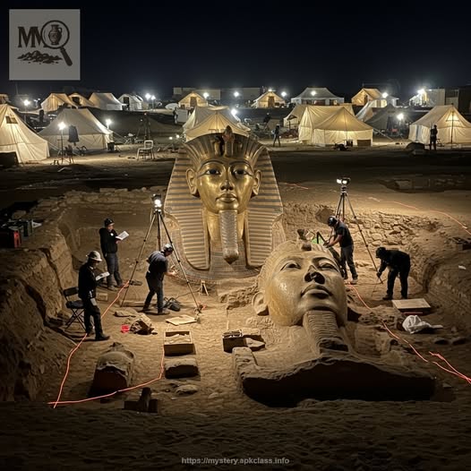 Under the harsh brilliance of floodlights, an archaeological dig in the desert has produced one of the most striking discoveries in recent memory: two colossal golden pharaoh masks, each towering over the very researchers striving to free them from the sands. The scene is nothing short of cinematic—teams of archaeologists carefully documenting every detail, surveyors measuring with precision, and rows of research tents glowing against the endless night horizon.